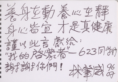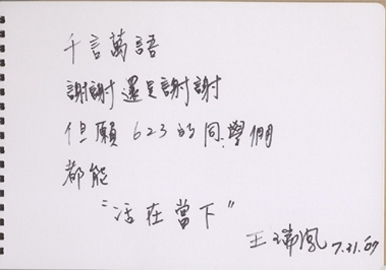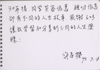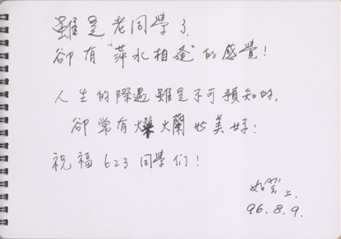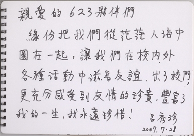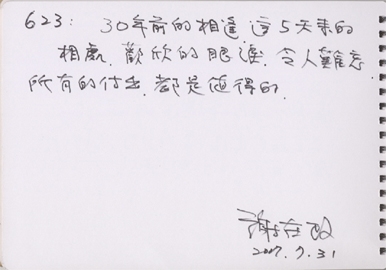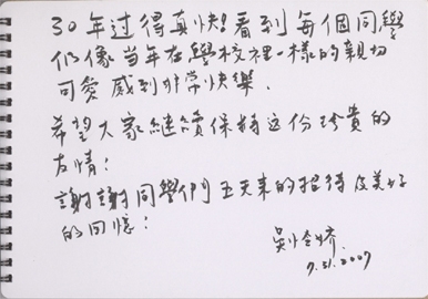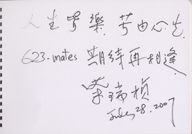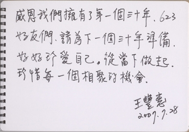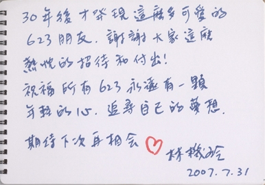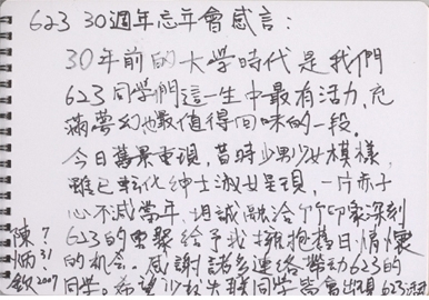 623三十週年同學會辦得有聲有色,七月二十七日(星期五)上午搭火車到宜蘭,下午參觀國立傳統藝術中心,晚上在礁溪老爺溫泉飯店聚餐、住房,七月二十八日(星期六)清晨前往林美石磐步道健行,下午回北醫座談,晚上在校園義大利餐廳團聚,共計六十名以上的同學參加,真是盛況空前!海外歸國同學多達十人,其中有五位同學參加三十週年會後三天的全台之旅,參觀淡水紅毛城、安平古堡、四草綠色隧道、安平樹屋、億載金城、西子灣打狗領事館看夕陽、夜遊愛河、漁人碼頭,一路上除了說話,還是說話,大夥都想把過去三十年的故事在三天內說完,由高雄返台北的車上,唱了三百多公里的卡拉OK,一百多條老歌耶。讓司機小弟都感到五十歲我們的活力與精力!