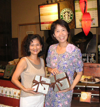 讀書餐會由十二點開始到二點半結束。會後員子同學與我到星巴克續攤,試想員子和小慈,兩位八卦女王撞在一起,真可是有交換不完的情報耶!我們一直聊到六點天黑才捨得分手,離開咖啡廳前,拿起櫃台前的二盒月餅,請服務人員幫我們拍照留念,祝各位同學中秋節快樂!希望各位同學下次有機會,務必參加謝在政同學的讀書會,瞧瞧他如何在美女如雲之中,滿面春風的享受退休生活!